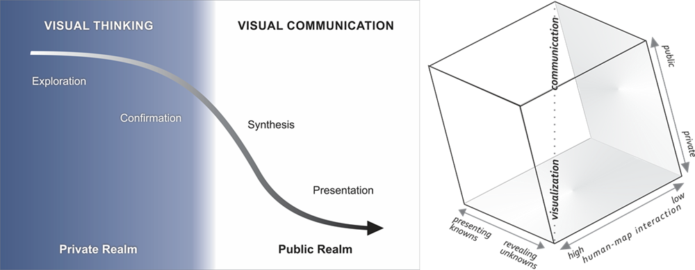 Cartographers have more control over shaping the readers’ interpretation of a map in some cases versus the other. MacEachren’s (1994) Cartography3, which expands upon the SWOOPY framework proposed by DiBiase (1990), suggests that maps exist on a continuum ranging from visual thinking to visual communication (See Geovisualization, Çöltekin et al. 2018). More exploratory maps that are geared towards scientific exploration and visual thinking offer greater possibilities for interaction. At the other end of the spectrum are maps geared towards scientific communication. These maps generally constrain interaction and are focused on presenting known insights to their readers.