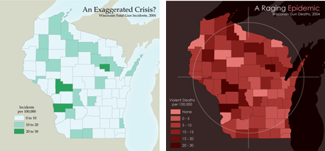 Both maps are created from the same data but tell very different stories (see Aesthetics and Design, Nestel 2019). The first map makes it seem that gun violence is not a major issue using pastel greens and by organizing most of the data into bins with light colors. The second map is alarmist in nature and calls attention to the issue of gun violence. It achieves this by using a color scheme with all dark, saturated reds with many classes. It adds a crosshair as an embellishment as well. In both cases, the cartographer has made deliberate design choices to emphasize a particular message. The titles of the maps are also slants in that they create a particular impression of an issue that prime readers to interpret the meaning of the map a certain way.